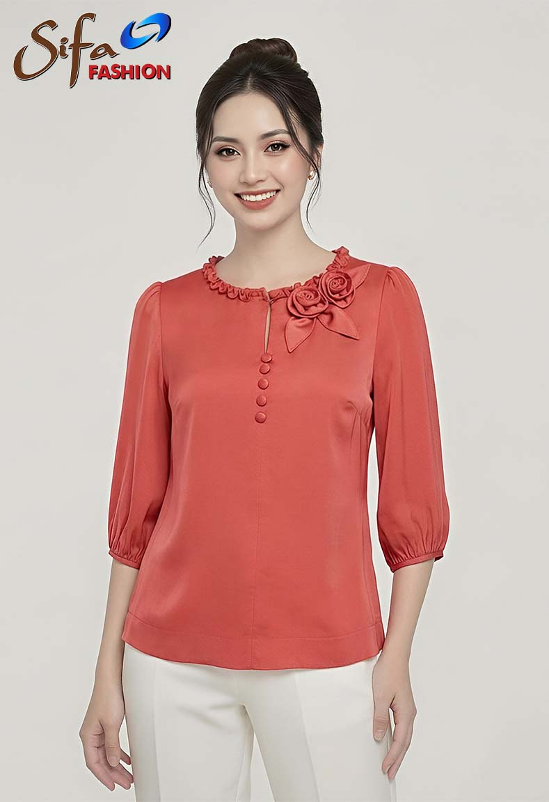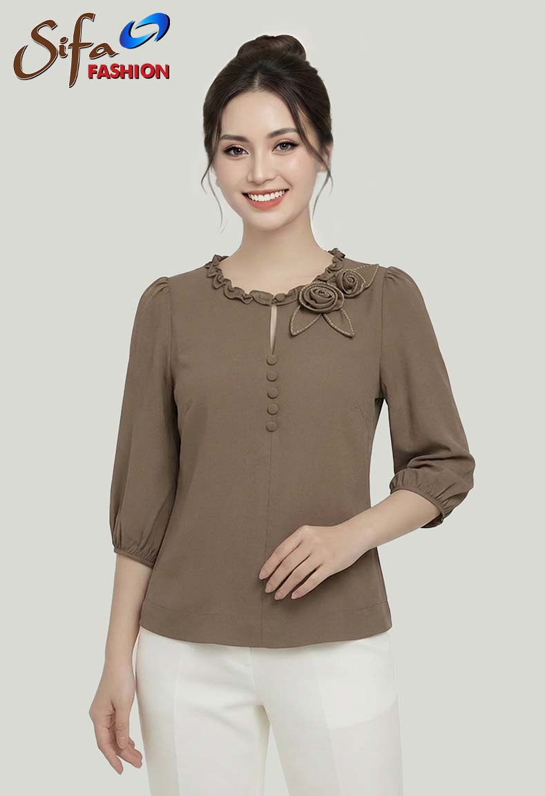 MÔ TẢ SẢN PHẨM: Chiếc áo cổ tròn với thiết kế xẻ V tinh tế, điểm xuyến thêm bèo nhún kết hợp đính hoa 3D nghệ thuật tạo nên vẻ đẹp nghệ thuật độc đáo. Phần tay áo phồng vừa thanh thoát lại vừa nữ tính, mang đến sự thoải mái và phong cách nổi bật cho người mặc.