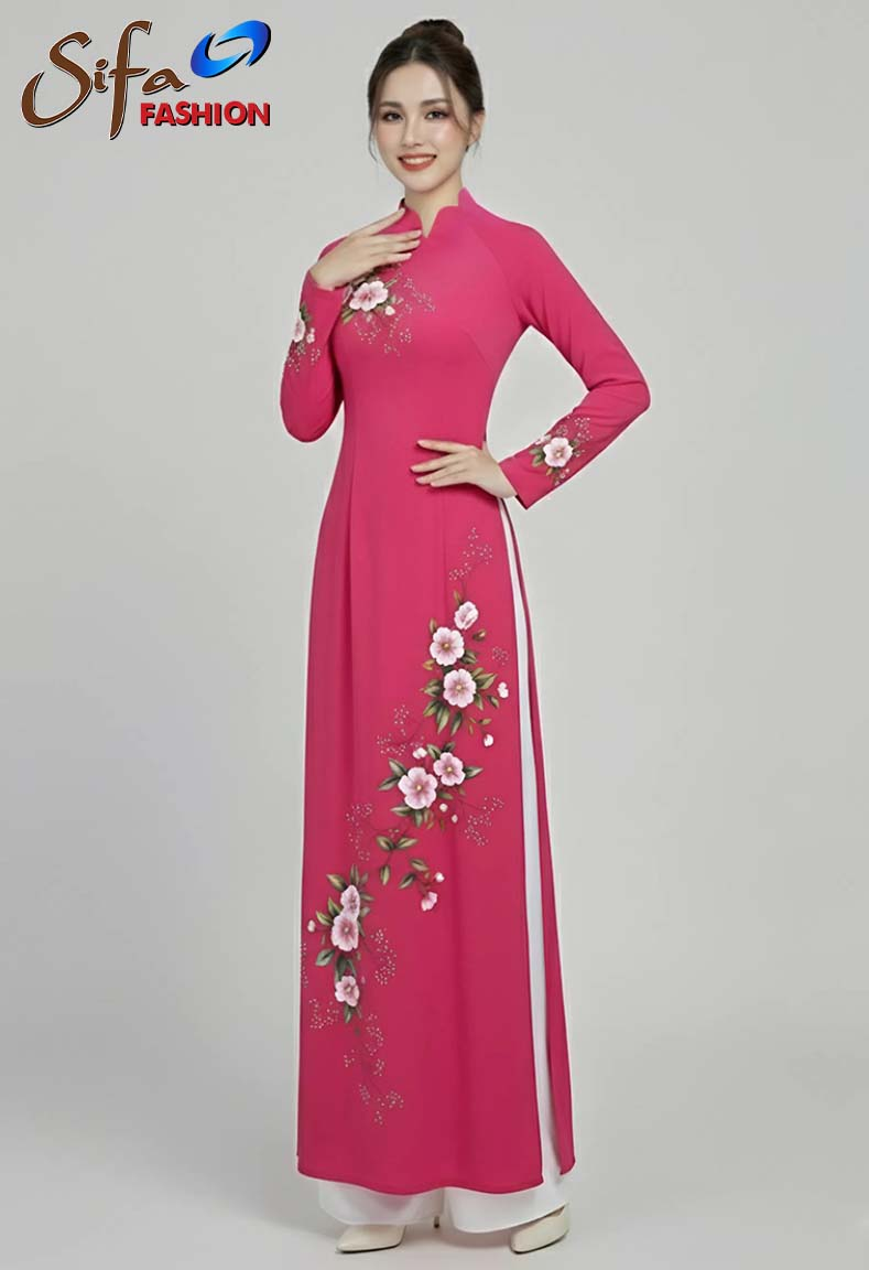 MÔ TẢ SẢN PHẨM: Áo dài cổ tim lượn, vẽ hoa nghệ thuật kết hợp dán đá.