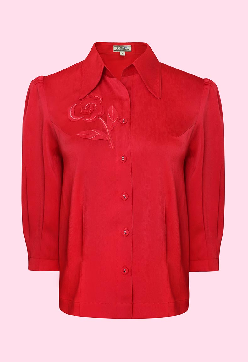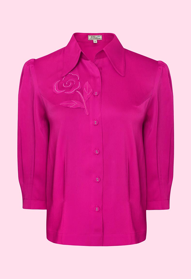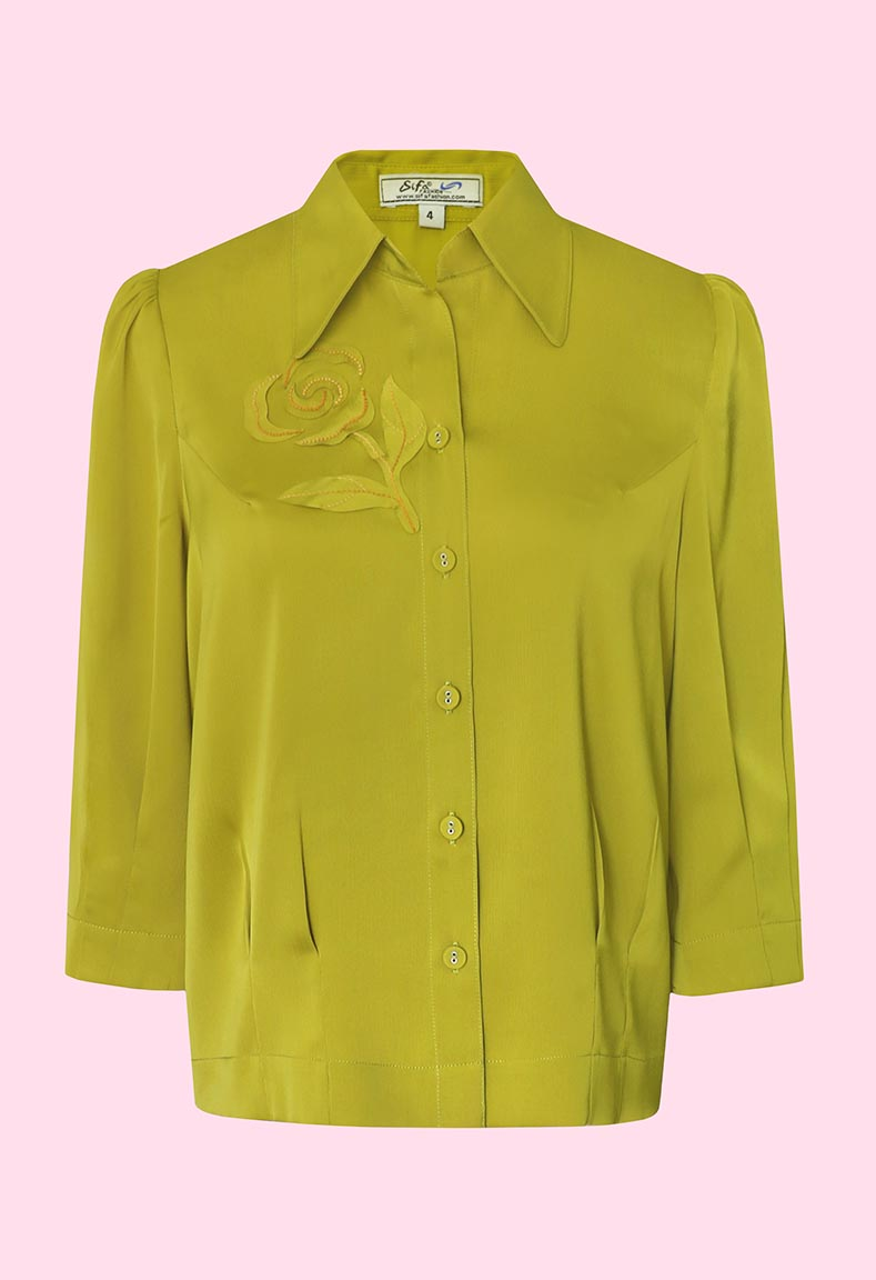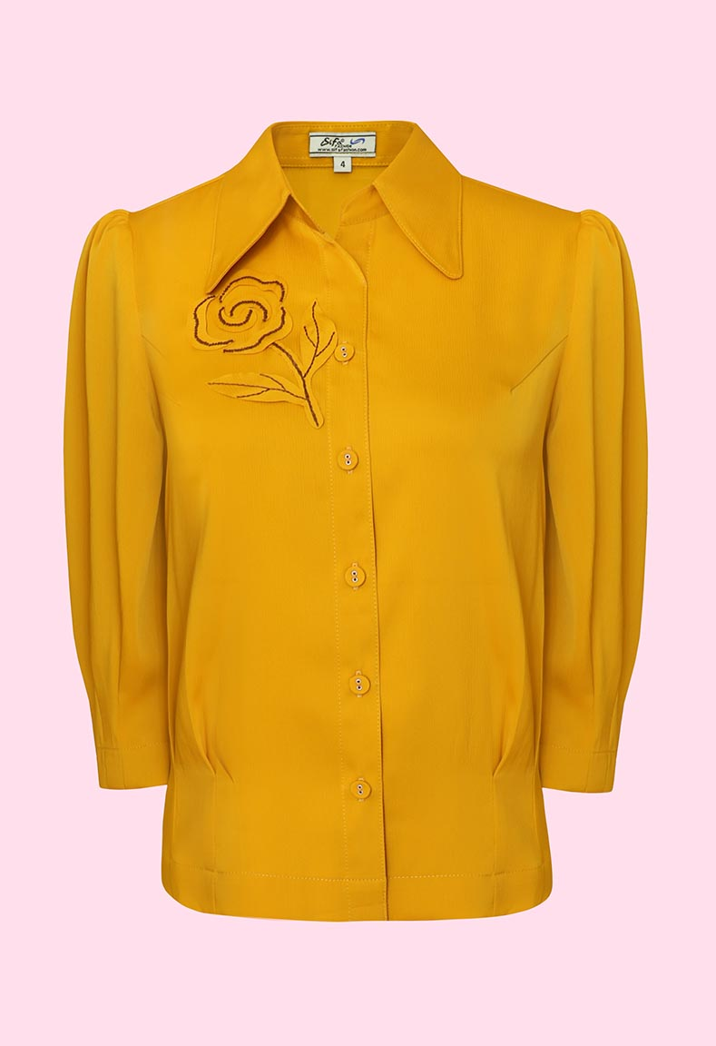 MÔ TẢ SẢN PHẨM: Áo sơ mi, tay lỡ bo chạy ly. Bo lai, thêu và đắp hoa thủ công.