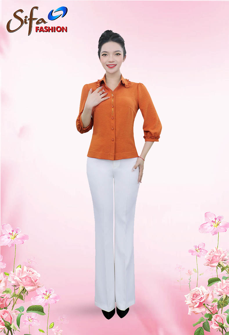 MÔ TẢ SẢN PHẨM: Áo sơ mi cổ sen bèo tay lửng phồng, bèo nhúng. Nẹp thêu hoa, kết nút xinh.